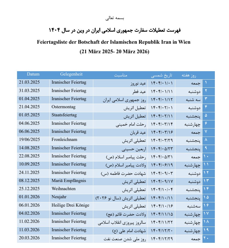 Feiertagsliste der Botschaft der Islamischen Republik Iran in Wien (21 März 2025- 20 März 2026)