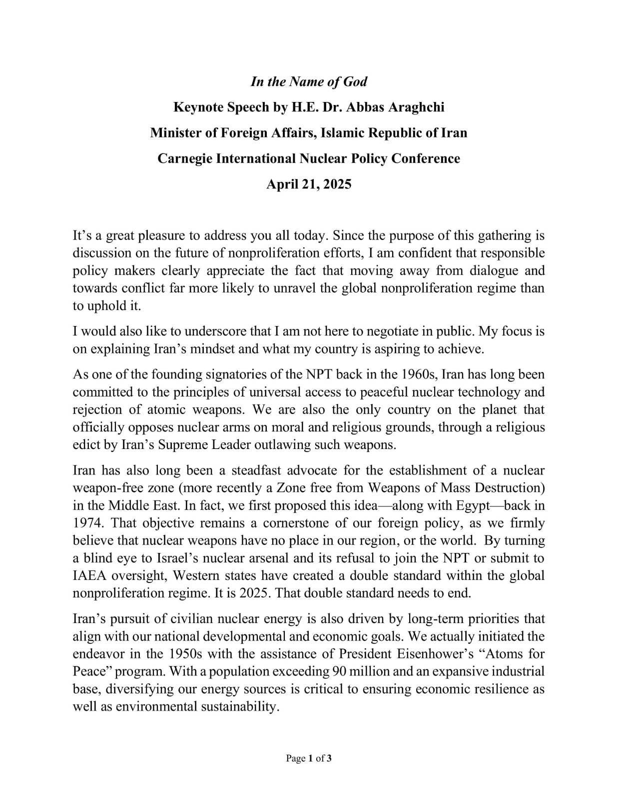 Keynote speech by H.E. Dr. Abbas Araghchi the Iranian Foreign Minister that was to be presented at the Carnegie International Nuclear Policy Confere