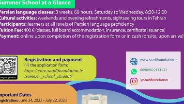 Registration: June 24,2023-July 22,2023 www.saadifoundation.ir fill the application form: http://core.saadifoundation.ir/summer_school_student