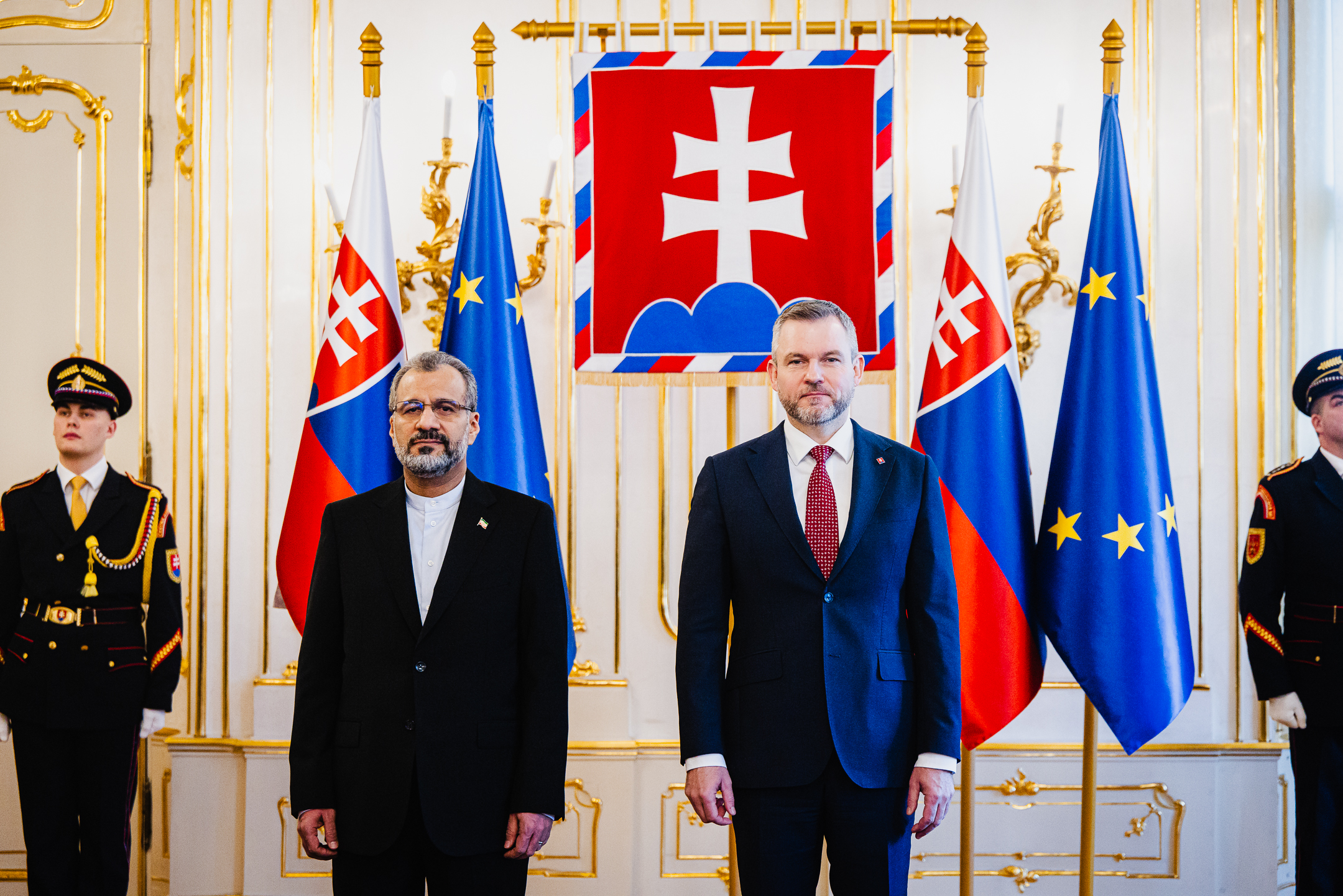 مراسم تقدیم استوارنامه جناب آقای اشراق جهرمی، سفیر جمهوری اسلامی ایران به آقای پتر پلگرینی، رئیس جمهور اسلواکی